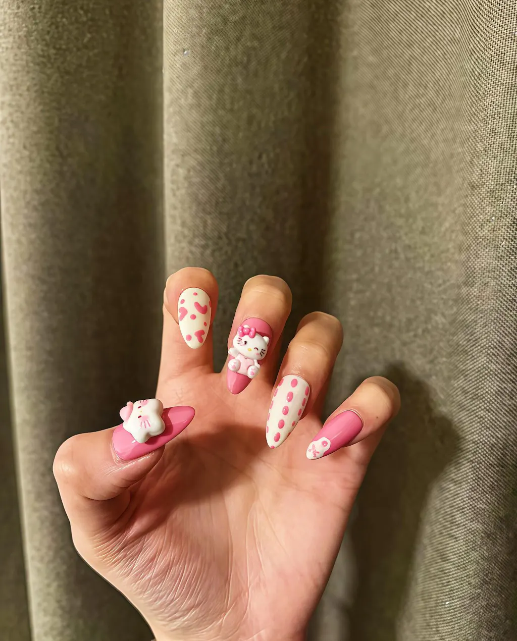Kawaii Crisis is a handmade press on nails set built for maximum sweetness — pink and cream almond nails with hand-painted hearts, pastel polka dots, and Hello Kitty 3D charms (including one wearing a star hat). Made for the ones who turn heads at the claw machine and ghost texts in pink bows.