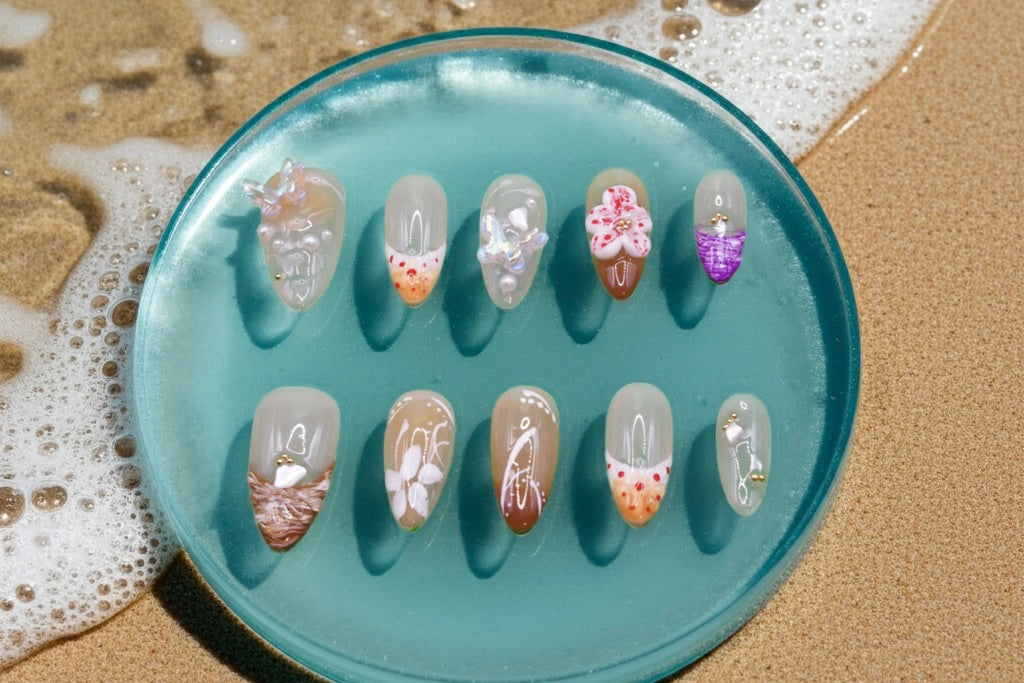 Der sandete tær møter sommerfuglkyss – Coastal Bloom er din solfylte flukt i negleform. Med en strand-inspirert palett av kremfarget beige og myke nøytrale toner, fremhevet av skjell-teksturer, lekne blomster og hav-inspirerte sommerfugler, gir dette negle settet syden-vibber uten flybilletten. Det er mykt, kunstnerisk og litt finurlig – perfekt for jenter som spiser brunsj ved vannet og blomstrer i brisen.