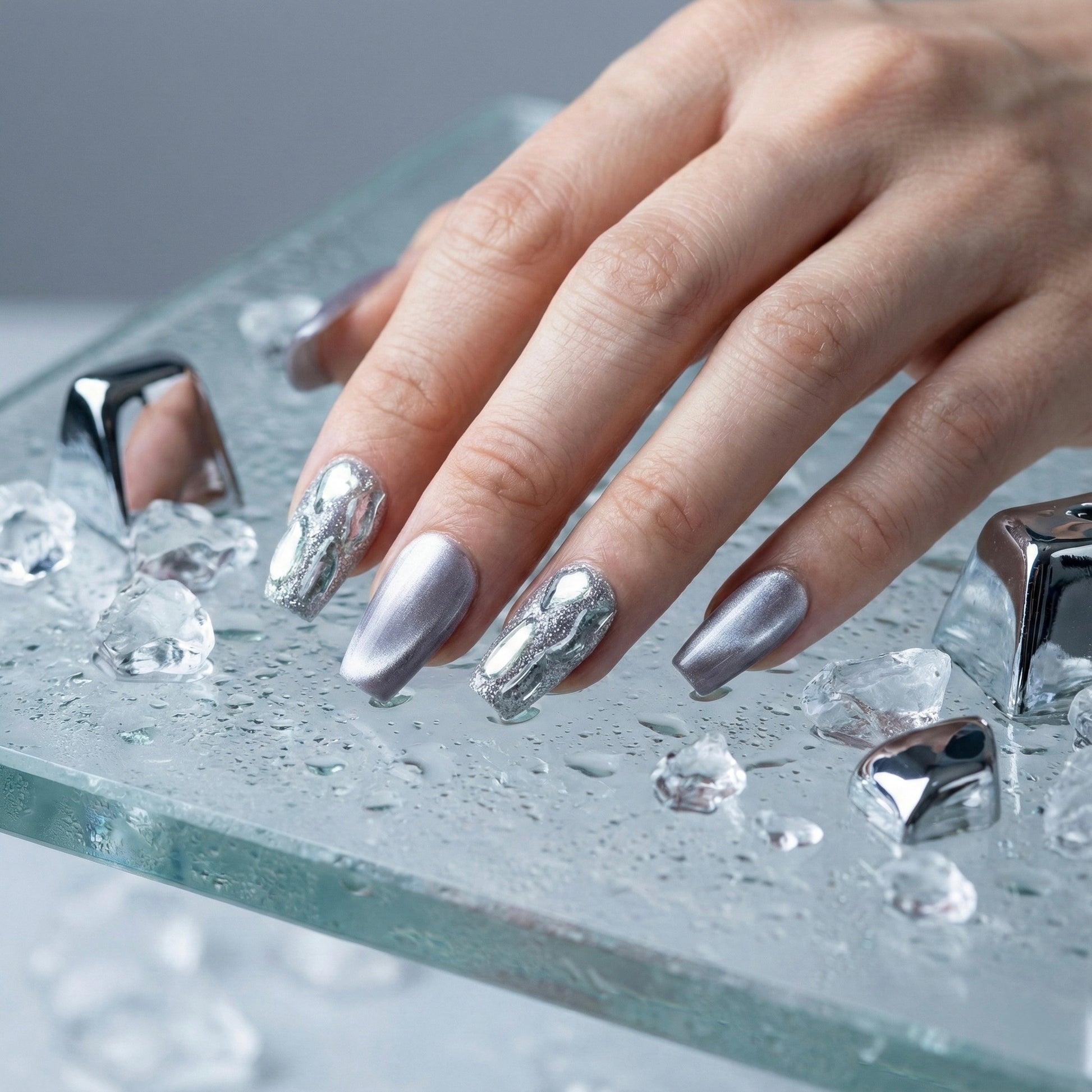 Gli inn i en vinterdrøm med Frostbite, en krom-dyppet isdronning-fantasi. Dette negle settet kombinerer et kjølig lavendel-skimmer med skulpturerte 3D-sølvdråper over en glitrende base – som frossent metall som tiner til glam. De er «fierce», futuristiske og klare for å eie enhver sesong.